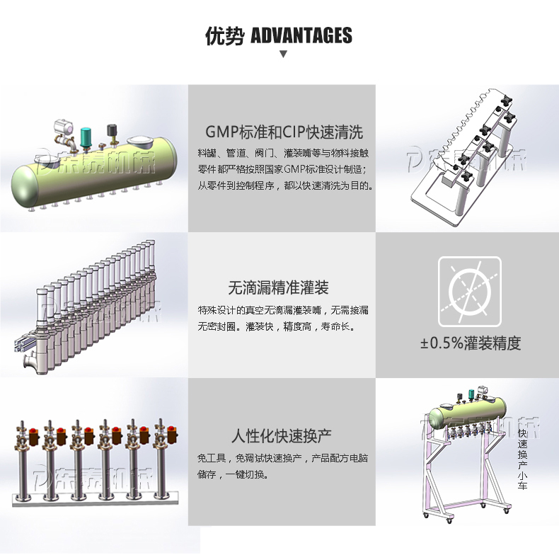 H、灌装闷头采用防拉丝及升降灌装装置。